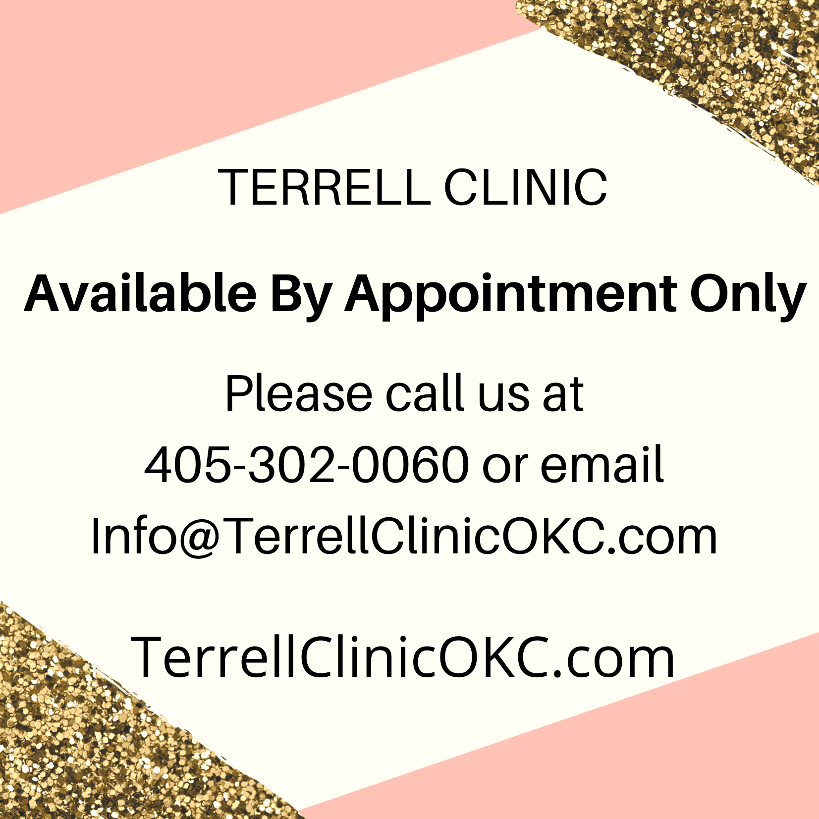 If you would like to schedule an appointment or have any questions, please email us at Info@TerrellClinicOKC.com, use our online contact form via TerrellClinicOKC.com, or call us at 405-302-0060. We appreciate your support and understanding during this difficult time. We are praying for the health and well-being of our community, country and the world-at-large. We have faith and hope that God will get us ??? through this uneasy time period. United We Stand.